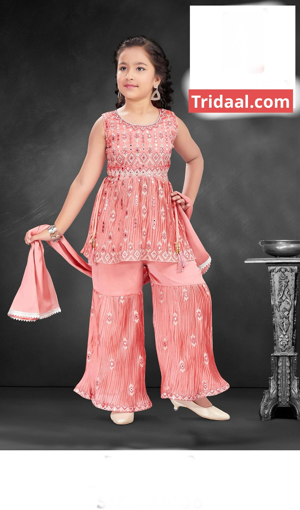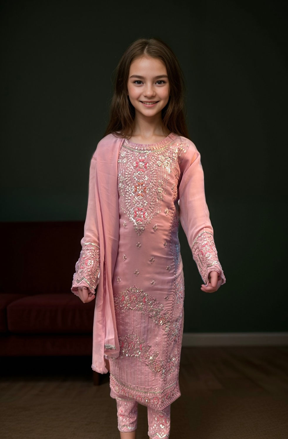 Elegant Girls’ Embroidered Kurti Set with Stone Work – Pink, Blue, & Peach – Siz